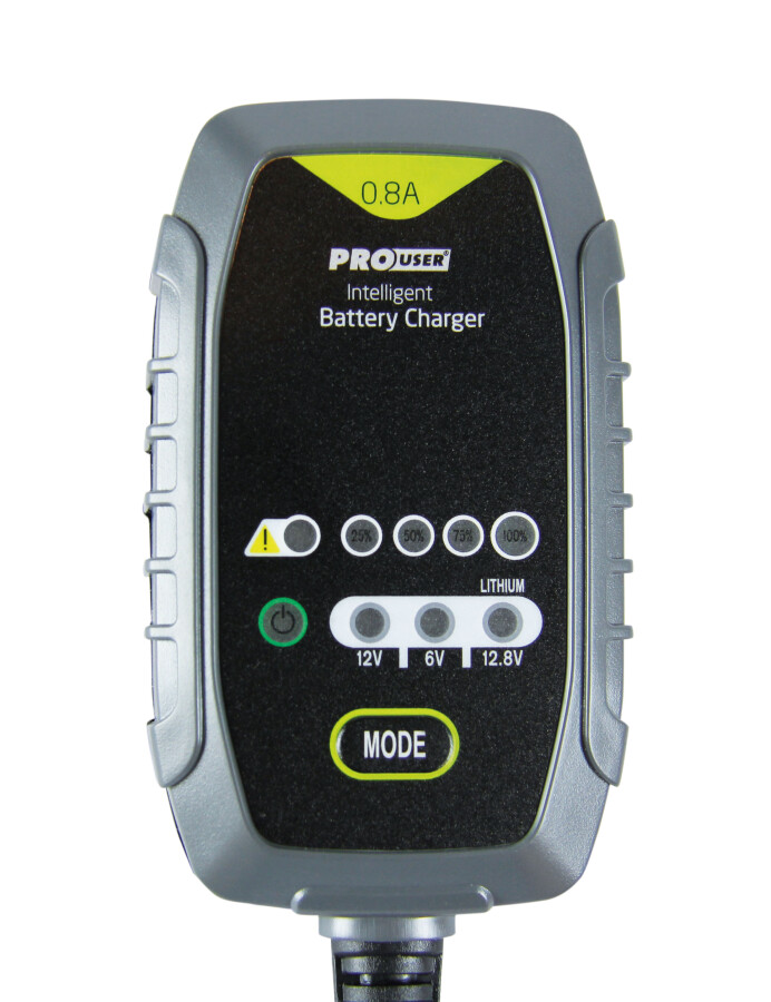 De IBC800 intelligente acculader is perfect voor kleine (motorfiets) accu' van 6 en 12 V. Hij genereert tot 0.8 DC laadstroom en is geschikt voor de volgende typen accu's: 6 V & 12 V Loodzuur, Gel, Wet, VRLA (1.2-26Ah) en 12.8V Lithium accu's (2-15Ah).